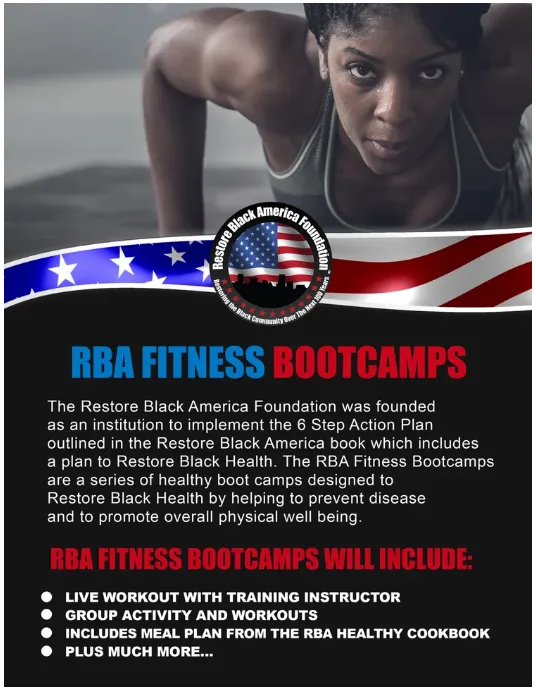 The Restore Black America Foundation was founded as an institution to implement the 6 step action plan outlined in the RBA book which includes a plan to Restore Black America. The RBA Fitness Bootcamps are a series of healthy boot camps designed to Restore Black Health by helping to prevent disease and to promote overall physical well being.