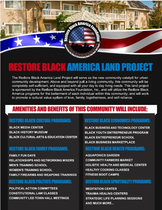 The Restore Black America Land Project will serve as the new community catalyst for urban community development. Above and beyond just a living community, this community will be completely self-sufficient, and equipped with all your day to day living needs. This land project is sponsored by the Restore Black America Foundation, Inc., and will utilize Restore Black America programs for the betterment of each individual within this community; and will work to promote a cultural value system of love, family and togetherness, and self-reliance.